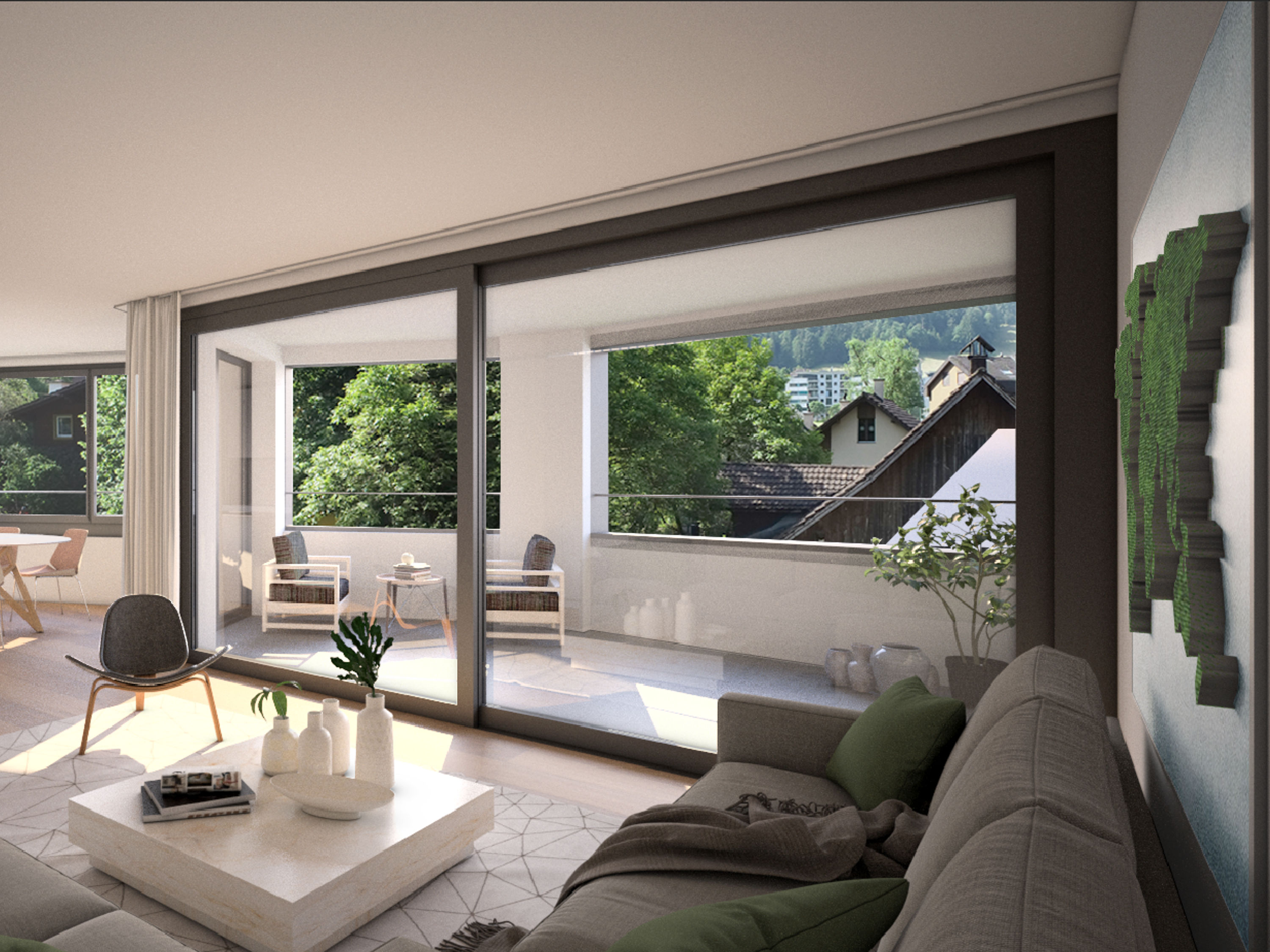 Die nach Süden ausgerichteten Wohnungen schaffen ein schönes Raumgefühl mit viel Licht und Aussicht auf den Hergiswald und den Pilatus. Jede Wohnung verfügt über einen grosszügigen Wohn- und Essbereich, sowie eine Loggia mit bodentiefen Fenstern. Die Wohnungen im Erdgeschoss sowie im ersten Obergeschoss haben eigene Gartenflächen. Die beiden Wohnungen im dritten Obergeschoss profitieren von exklusiven Dachterrassen mit viel Privatsphäre.